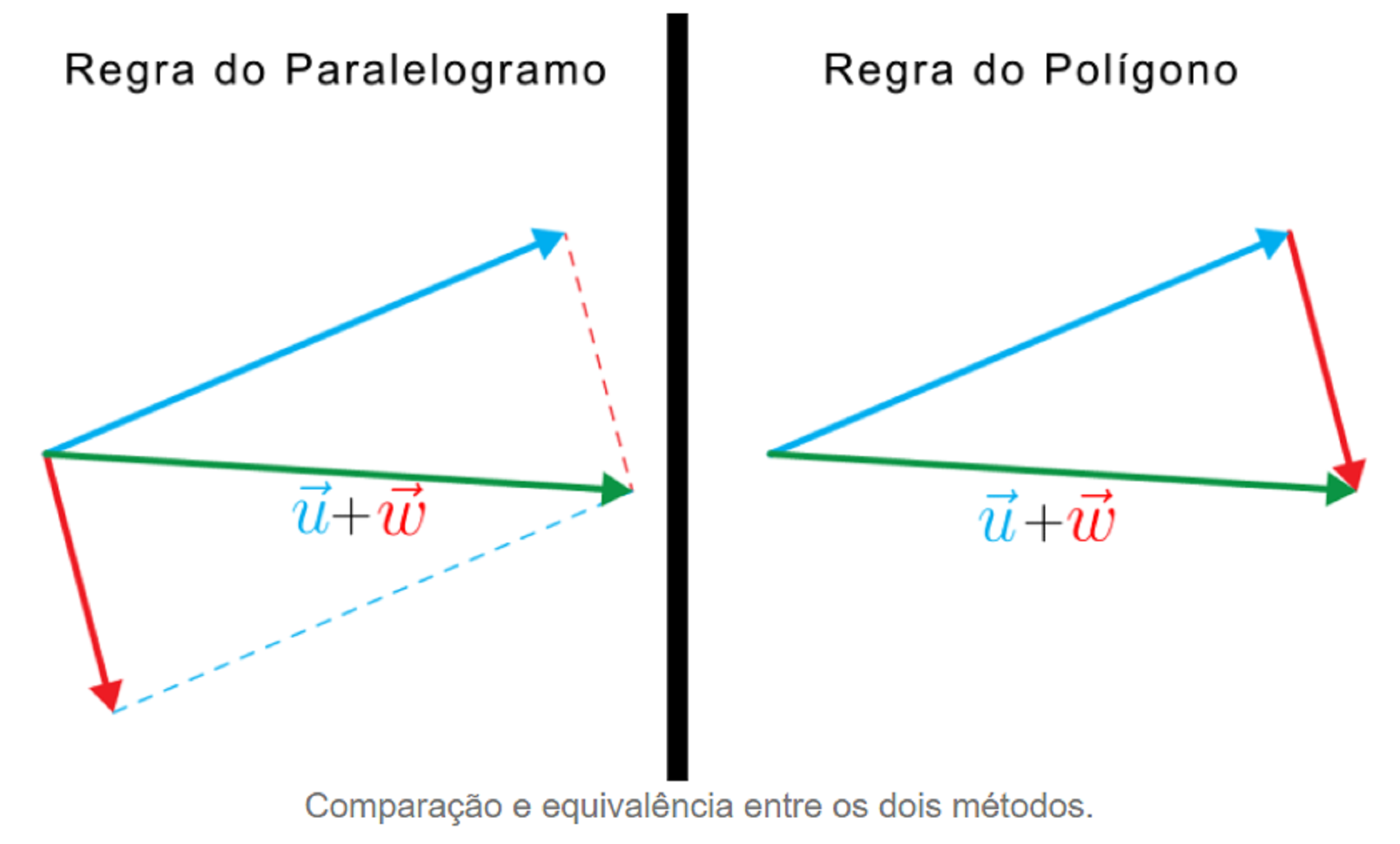 Através da imagem abaixo podemos ver que, independente da regra usada (polígono ou paralelogramo), o resultado será sempre o mesmo: